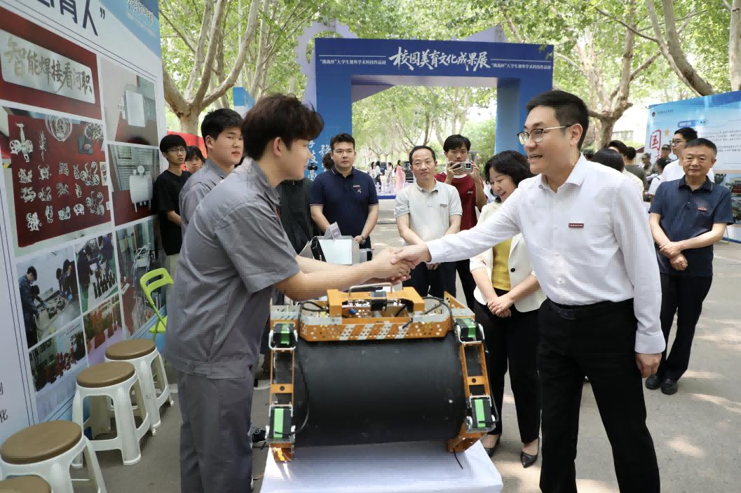 5月28日上午,学校“文化铸魂 科技赋能”校园美育文化成果暨“挑战杯”大员工课外学术科技作品展在校园内隆重举行。校党委书记厉励,校党委副书记、校长夏新颜等校领导亲临现场指导。太阳成集团tyc122cc展示了专业文创产品和部分大赛作品。图为校领导与太阳成集团tyc122cc参展师生亲切交流。